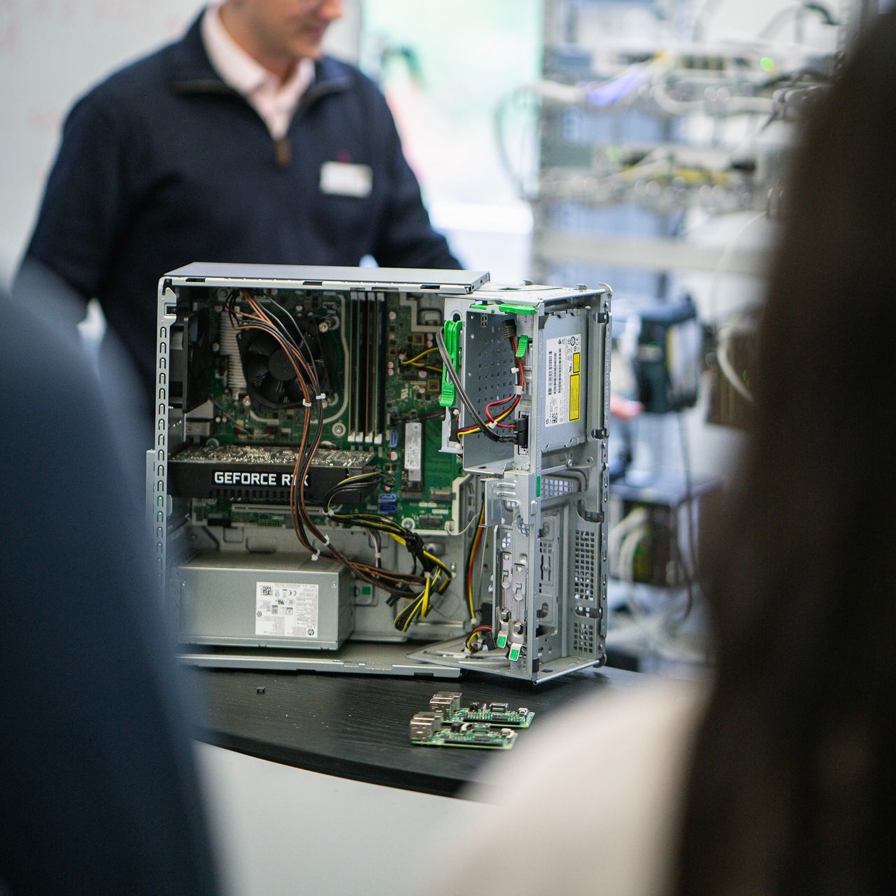Dabei programmierten sie Roboterarme, erfuhren, wie Cyberangriffe erkannt und abgewehrt werden, tüftelten gemeinsam an Hardware-Komponenten und setzten sich mit der Funktionsweise von Sensoren und der digitalen Datenverarbeitung im Alltag auseinander.